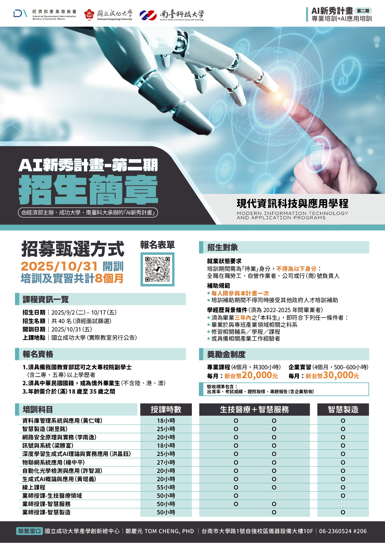 📢【轉知】【招生日期延至114.10.17截止】國立成功大學 AI 新秀專班,請有興趣之師生踴躍報名參加!!!