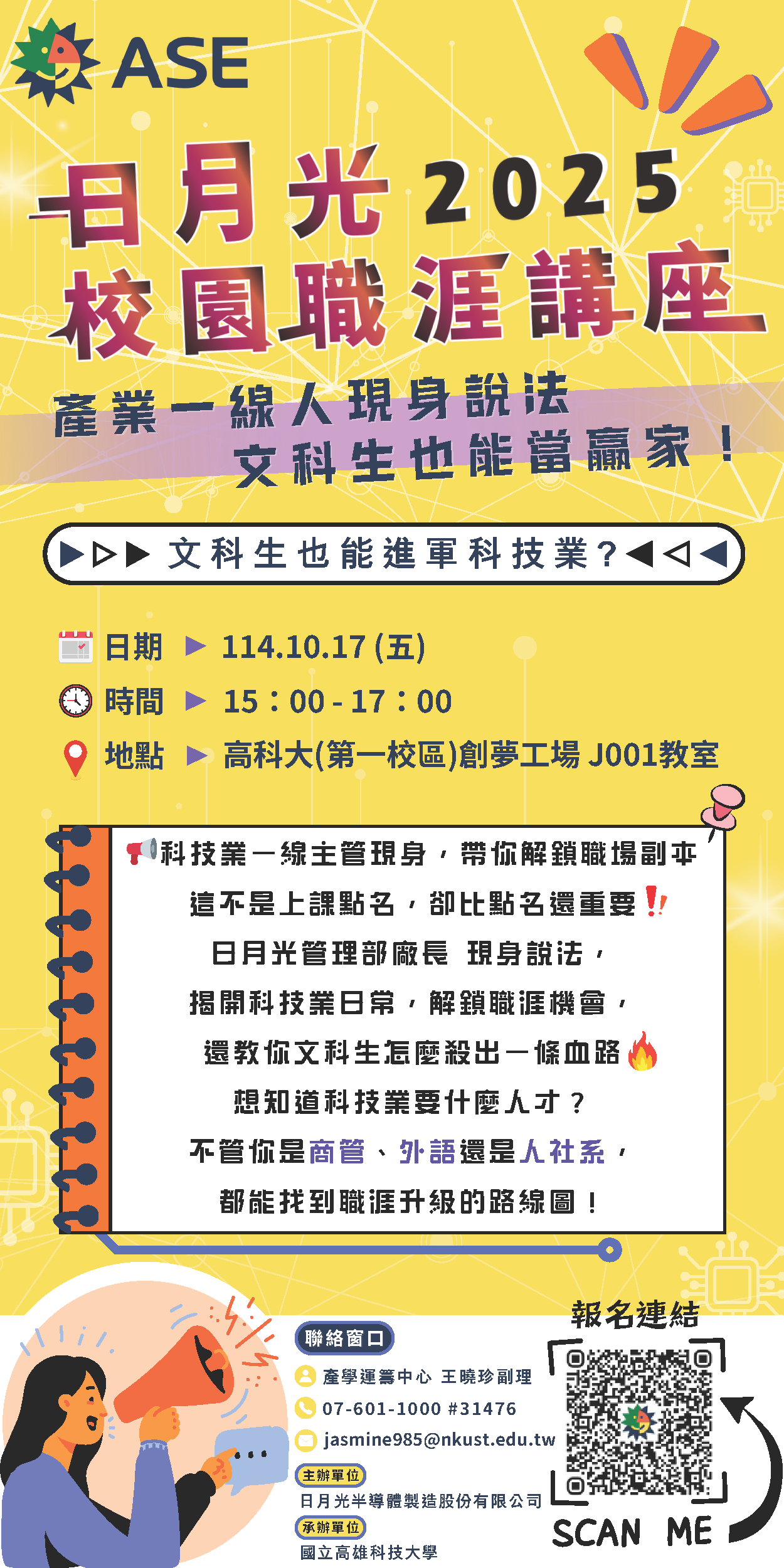 活動由日月光一線管理部廠長現身說法,帶你解鎖職場副本,揭開科技業日常,解鎖職涯機會,並教你文科生如何殺出一條血路🔥🔥